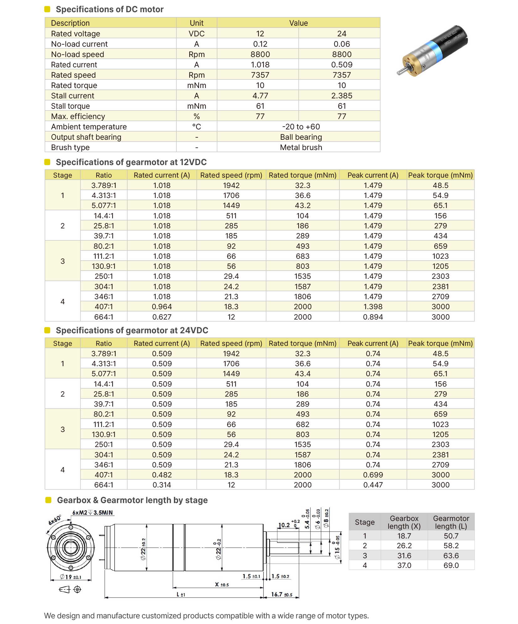 Outer diameter: Ø22 mmVoltage: 12 / 24 VDCReduction ratio: up to 664:1Rated torque: up to 2000 mNm