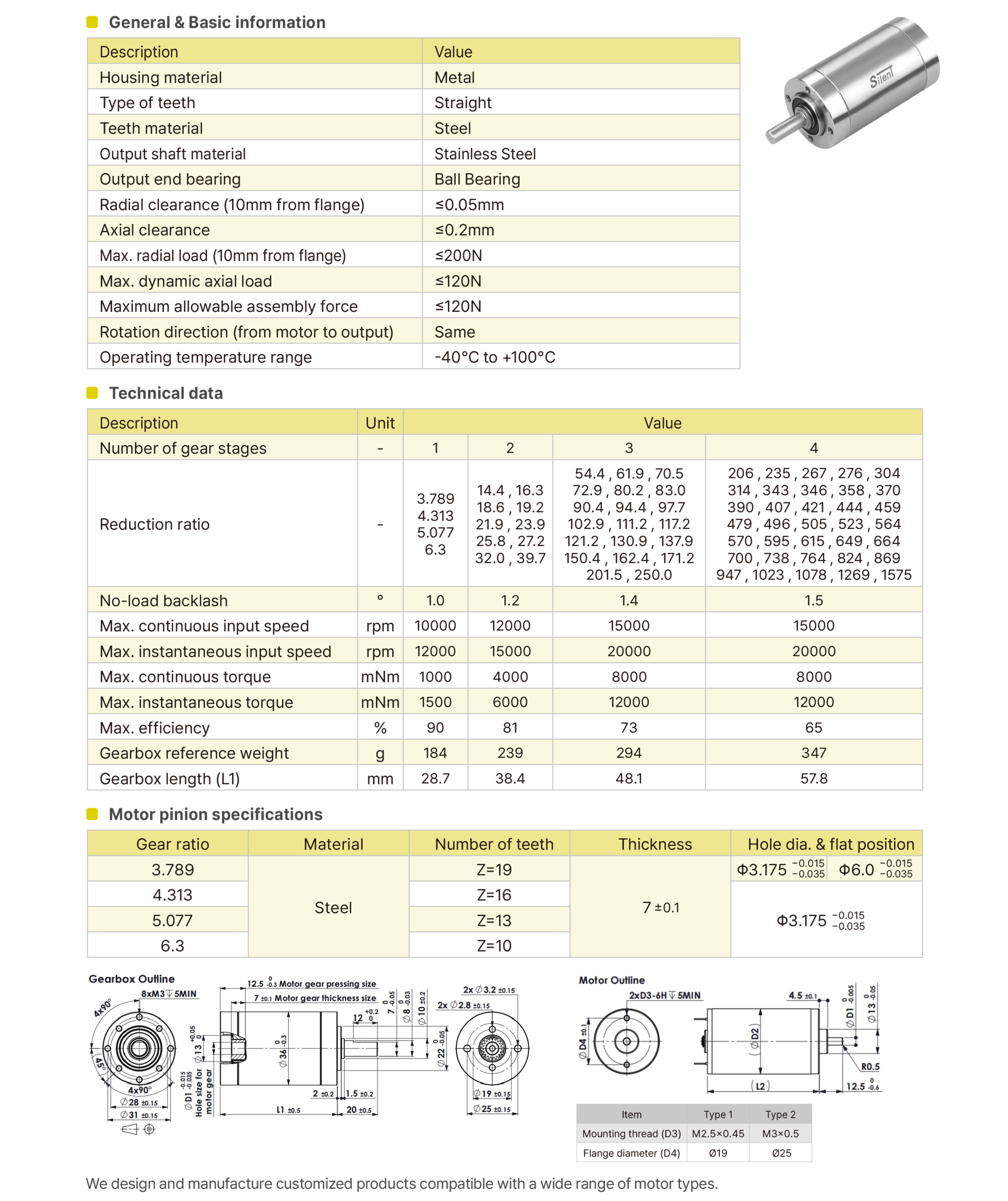 Outer diameter: Ø36 mmReduction ratio: up to 1575:1Max. continuous torque: up to 8000 mNmMax. radial load: ≤200 N