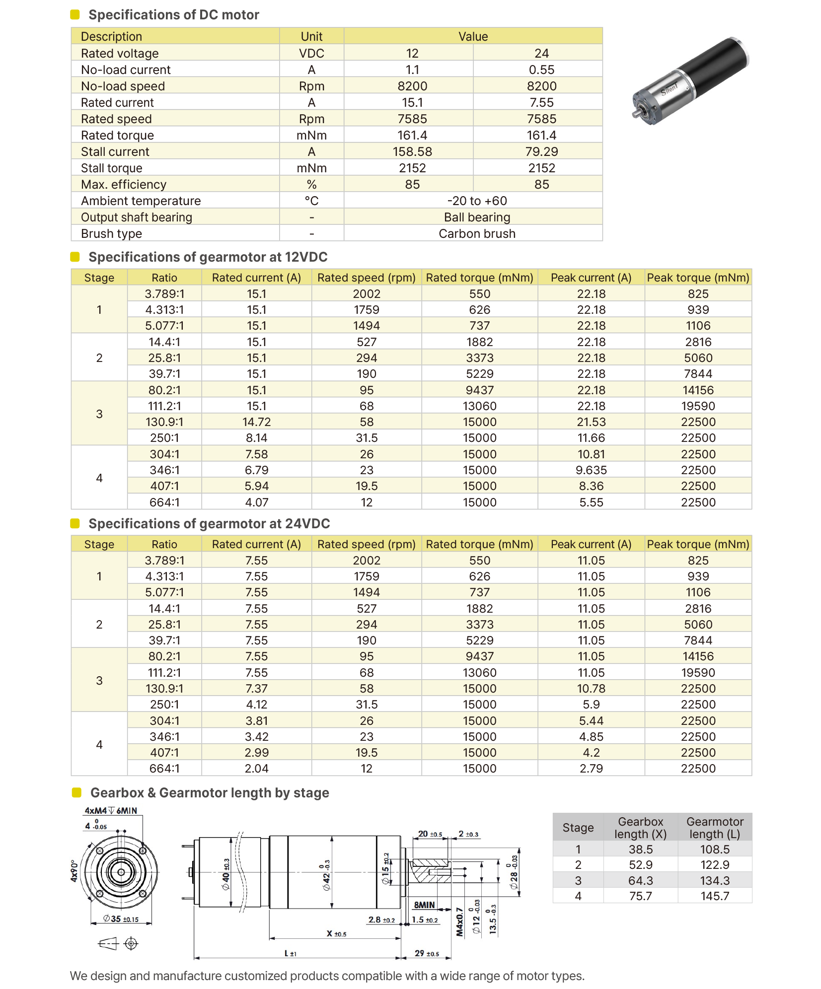 Outer diameter: Ø42 mmVoltage: 12 / 24 VDCReduction ratio: up to 664:1Rated torque: up to 15000 mNm