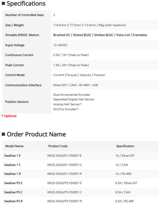 | Swallow 1 E | WE2S-D024/01-FS0057-E | 1A / EtherCAT |