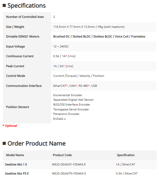 | Swallow Abs P5 E | WE2S-D024/P5-FS04A5-E | 0.5A / EtherCAT |