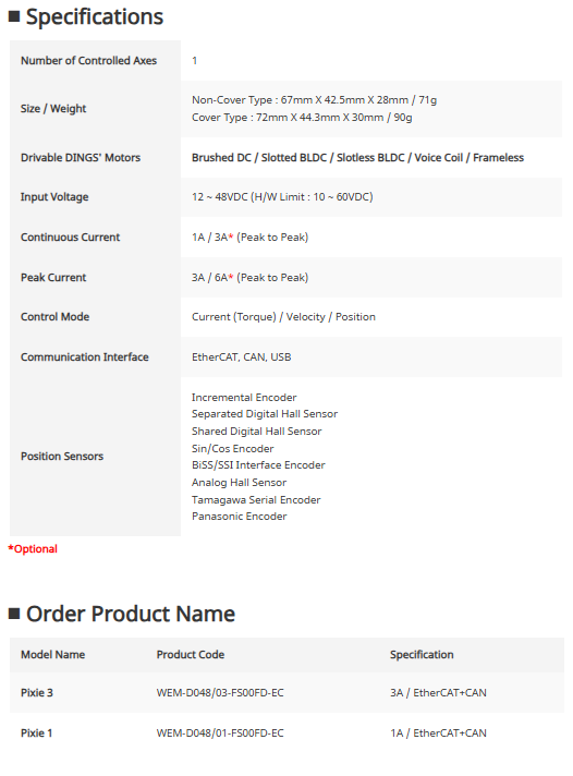 | Pixie 1 | WEM-D048/01-FS00FD-EC | 1A / EtherCAT+CAN |